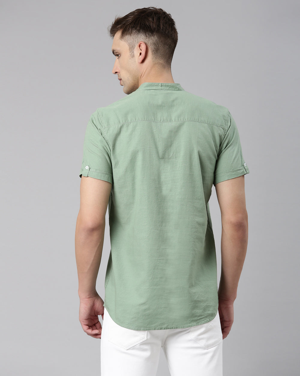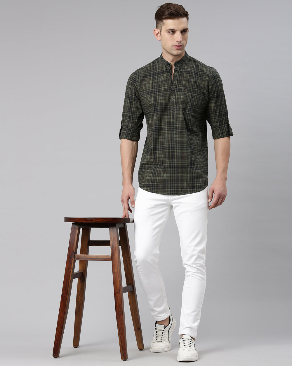 When you want to elevate your outfit, match your Chinese collar kurta with tailored trousers. Neutral shades like grey, beige, or black create a sleek and polished vibe, perfect for office gatherings, semi-formal dinners, or evening events. Add leather shoes and a watch to complete the smart ensemble.