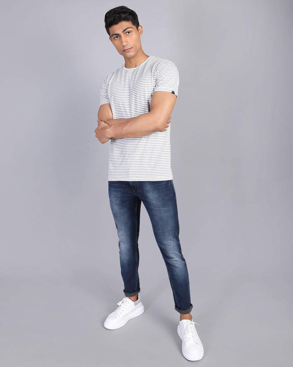 If plain colors feel too safe, striped round neck tshirts are a stylish alternative. They add dimension and can easily be paired with neutral bottoms.