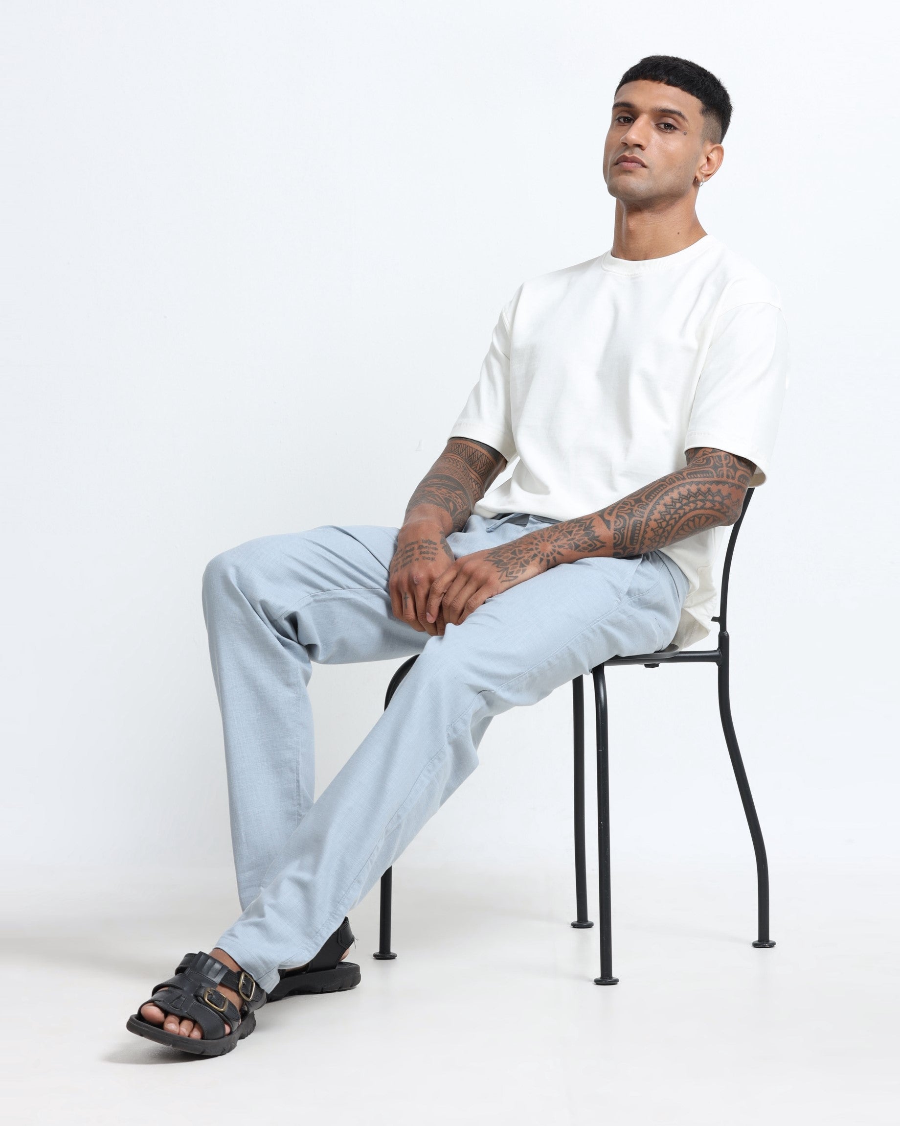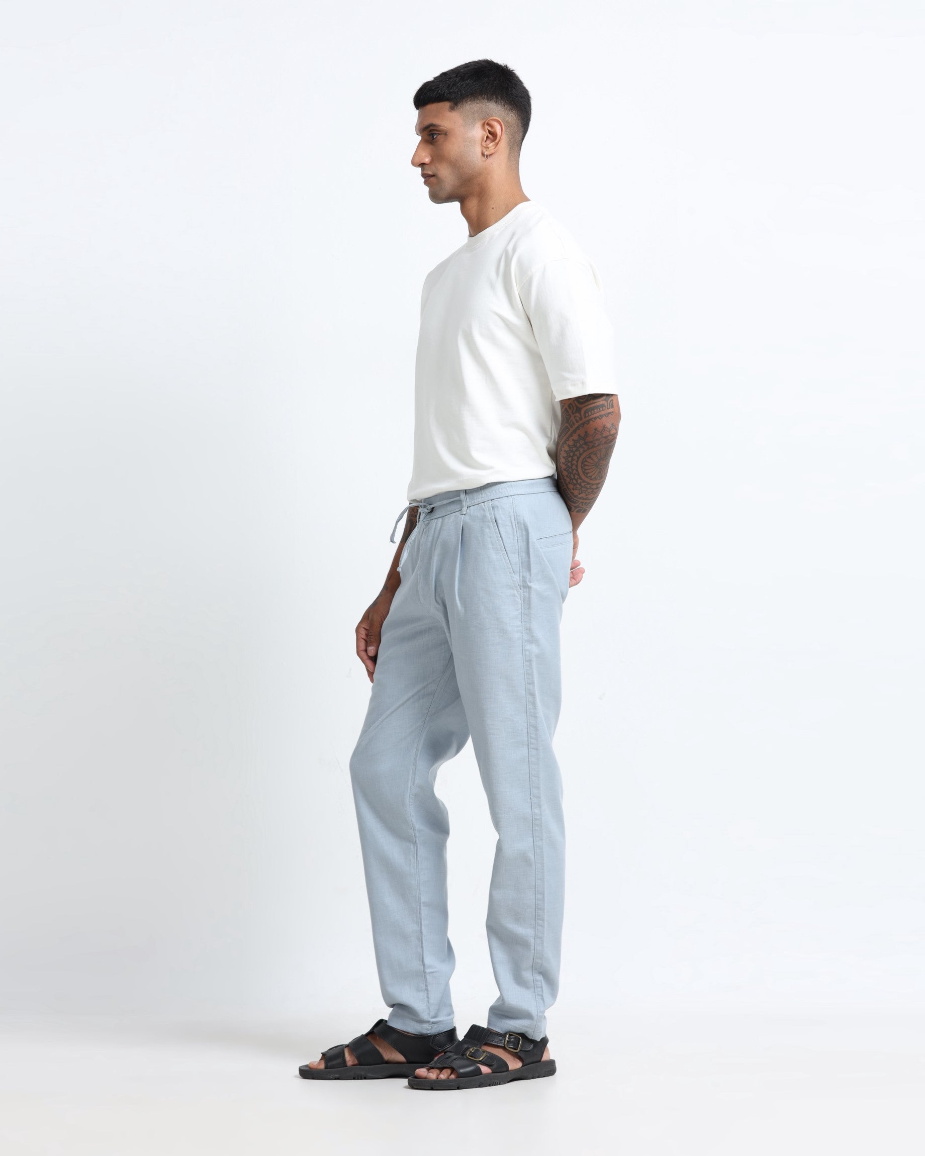 Lightweight, breathable, and effortlessly refined—these beige linen trousers are made for easy days and everyday wear. Designed with a relaxed, natural drape, they feature a single front pleat for subtle structure, paired with an elastic waistband and drawstrings for adjustable comfort and a modern, easygoing look.