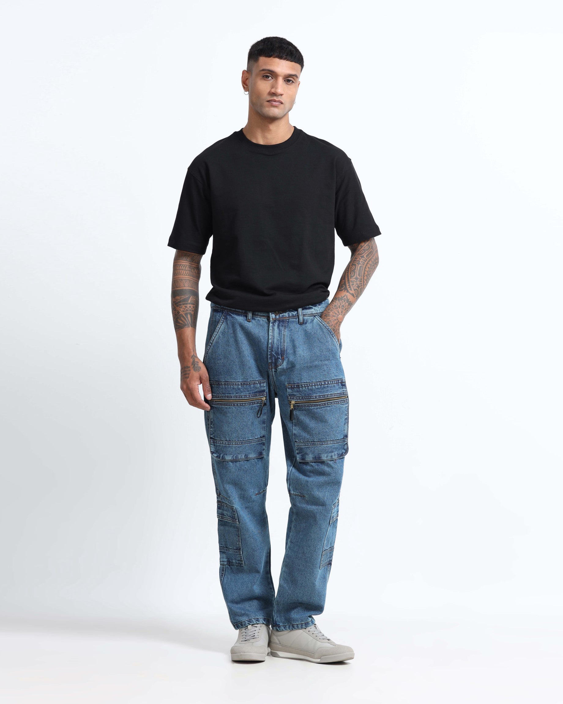 FIT: Relaxed, mid-rise silhouette with eight functional pockets, including two with zippers—built for utility, attitude, and unmistakable presence.